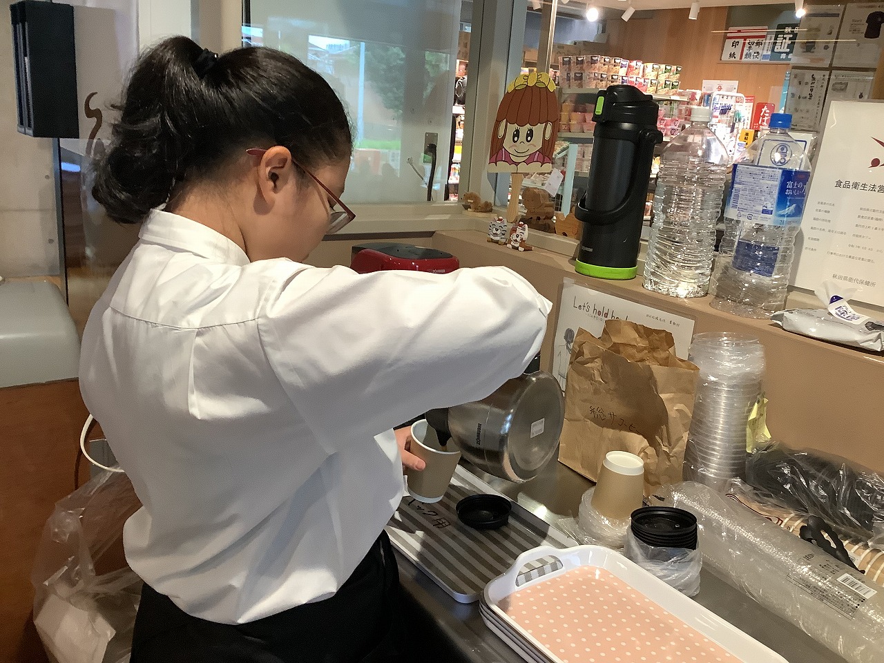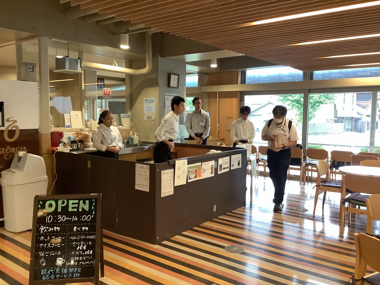 9月4日(木)と25日(木)の両日、高等部総合サービス班が市役所に出向き、カフェ実習を行いました。昨年度からの経験者もいますが、今年度のメンバーで初めてとなった木曜カフェ。緊張するかと思いきや、堂々と、そして心をこめて接客する様子に頼もしさを感じました。メニュー表、伝票、必要物品、取り扱う品の注文と、自分たちで準備してきたカフェをがんばりたいという思いが伝わり、その思いはお客様にも伝わったようでした。温かいお客様のおかげで有意義な学習ができました。