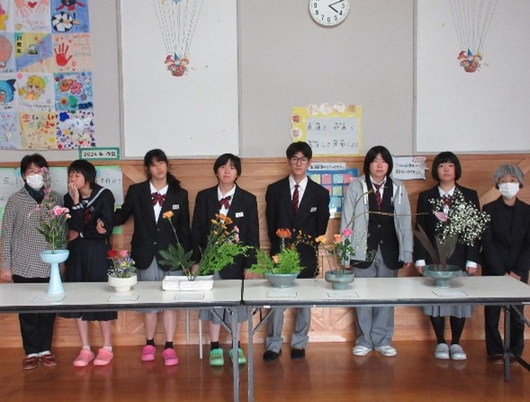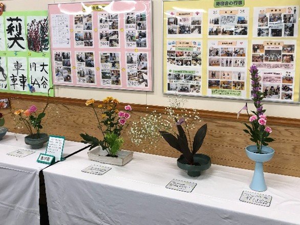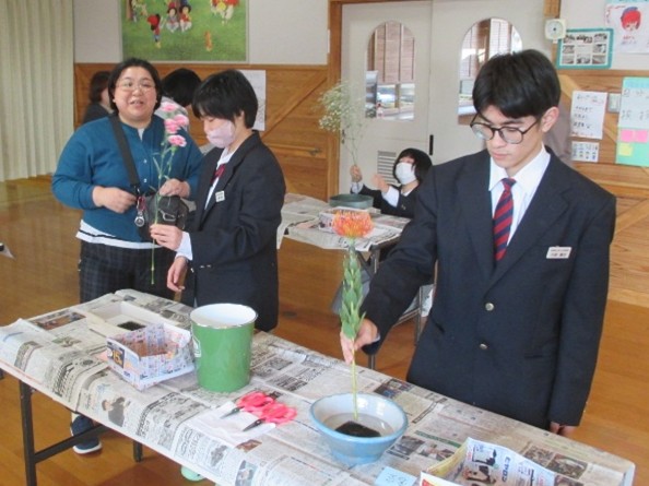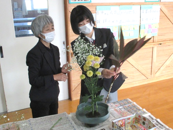 10月30日(木)に地域の先生をお迎えして、生け花交流会を行いました。6人の生徒が参加し、どこに生けるときれいに見えるかをいろんな角度から探したり、悩んだときは先生に相談したりして、生徒それぞれが思い思いに花を生けました。生けた後は、友達の作品の鑑賞や先生への質問コーナー等もあり、楽しく、有意義な時間となりました。