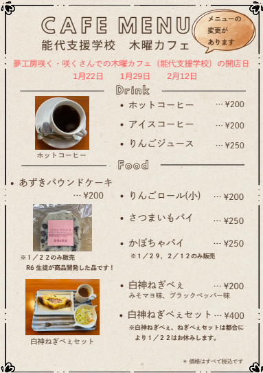 1・2月の「木曜カフェ」(咲く・咲く) メニュー変更のお知らせ