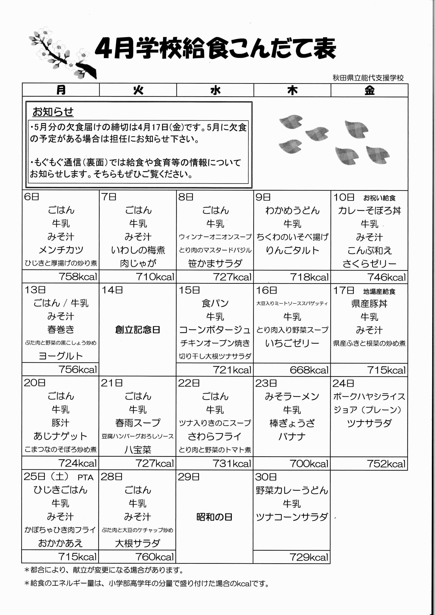 今月の給食のペー
